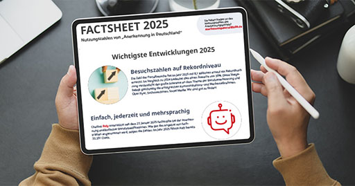 | Die Besuchszahlen von „Anerkennung in Deutschland“ haben sich gegenüber 2024 um 30 Prozent erhöht und einen neuen Rekord erreicht. Weitere Daten zur Portalnutzung bietet unser Jahres-Factsheet. |